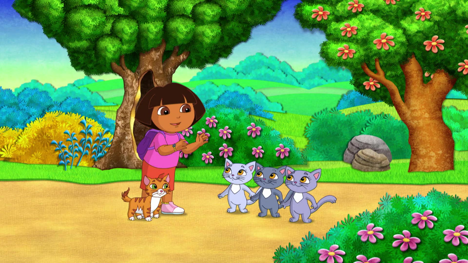 Dora raconte à Lucky, le chaton de Grandma, l'histoire des trois p'tits chats qui adoraient leurs moufles en laine et avaient composé une chanson pour leur maman. Mais un gros coup de vent les emporte!