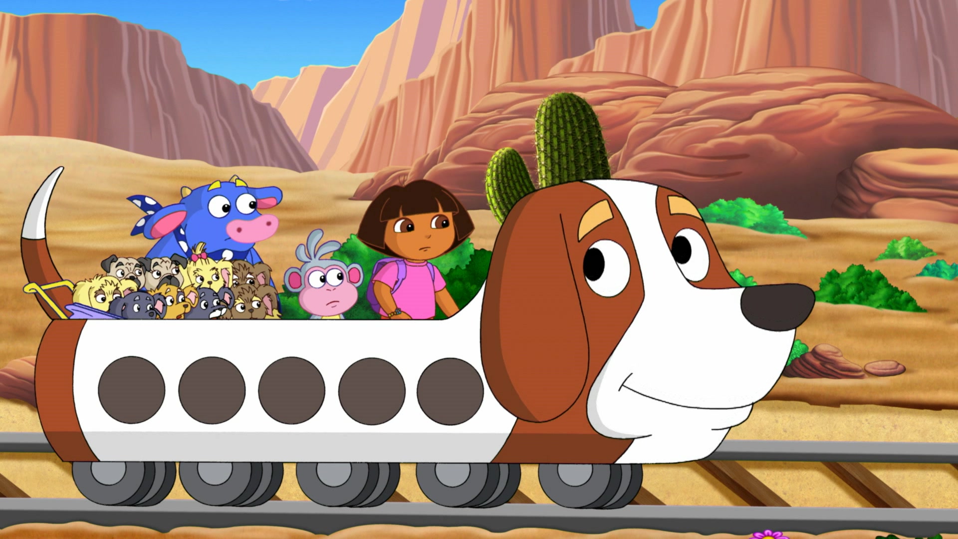 It's bath time! Dora et Babouche aident Totor à donner leur bain aux bébés chiens. Mais où est passé Little Boots? Ce petit coquin est parti en direction de la caverne de l'ours.