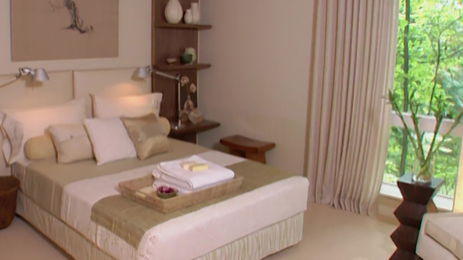Listen to the call of the jungle. Room Service host Sarah Richardson adds a leafy, natural touch to a standard-issue condo bedroom. Shades of walnut, celery and ivory give this bland bedroom tropical style. Sarah tries her hand at the potter's wheel and we learn how to create a simple, yet stunning padded headboard for the space. It may suffer the blahs now, but soon you'll have been transported to the tropics in this retreat!