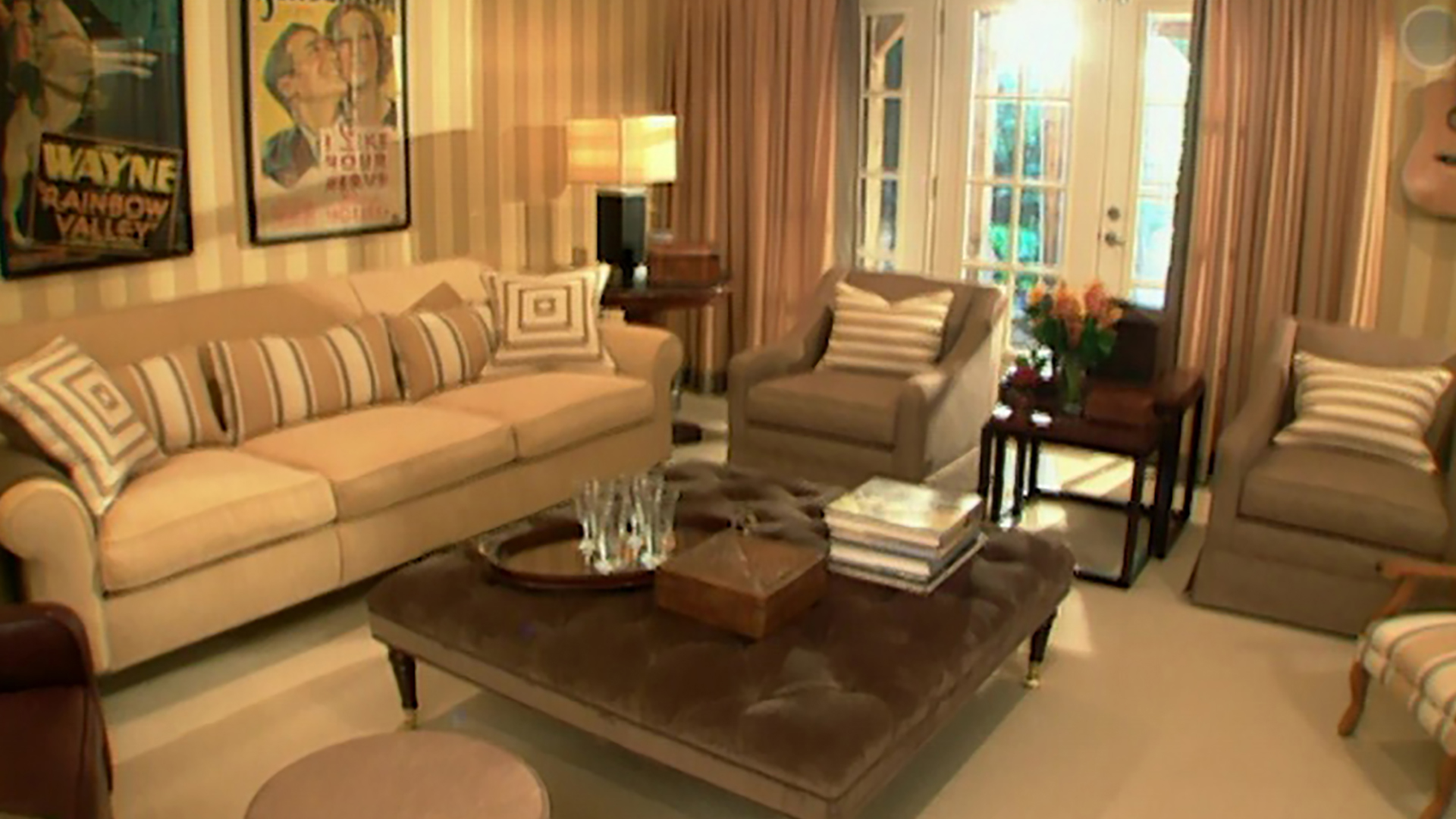 The kids are in bed and now it's time for you to play! Room Service softens up a family room, giving it Town and Country appeal. Host Sarah Richardson wraps the room in a welcoming palette of tobacco, camel, ebony and aubergine. She creates lampshades using craft paper and glue to warm up the space. We make the most of the client's cherished advertising art collection. This multi-media room helps the entire family kick back in style!
