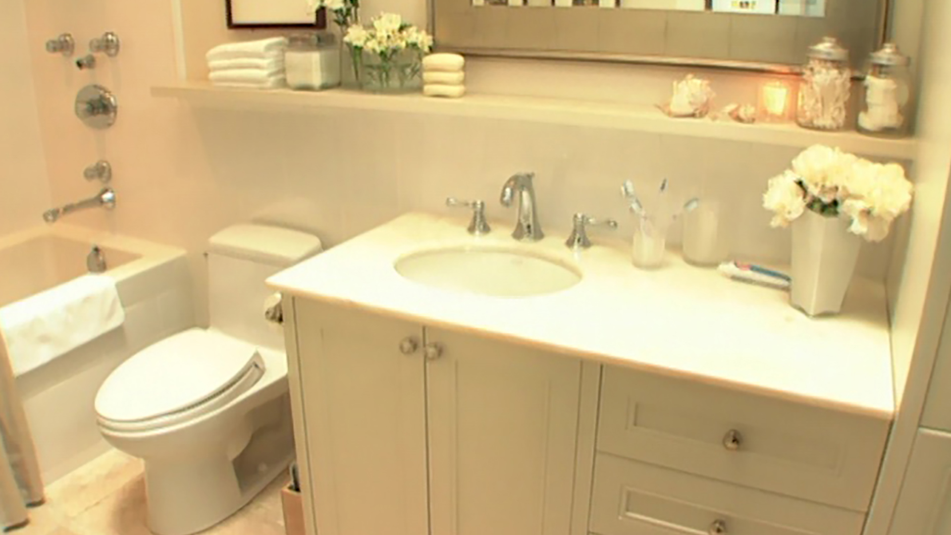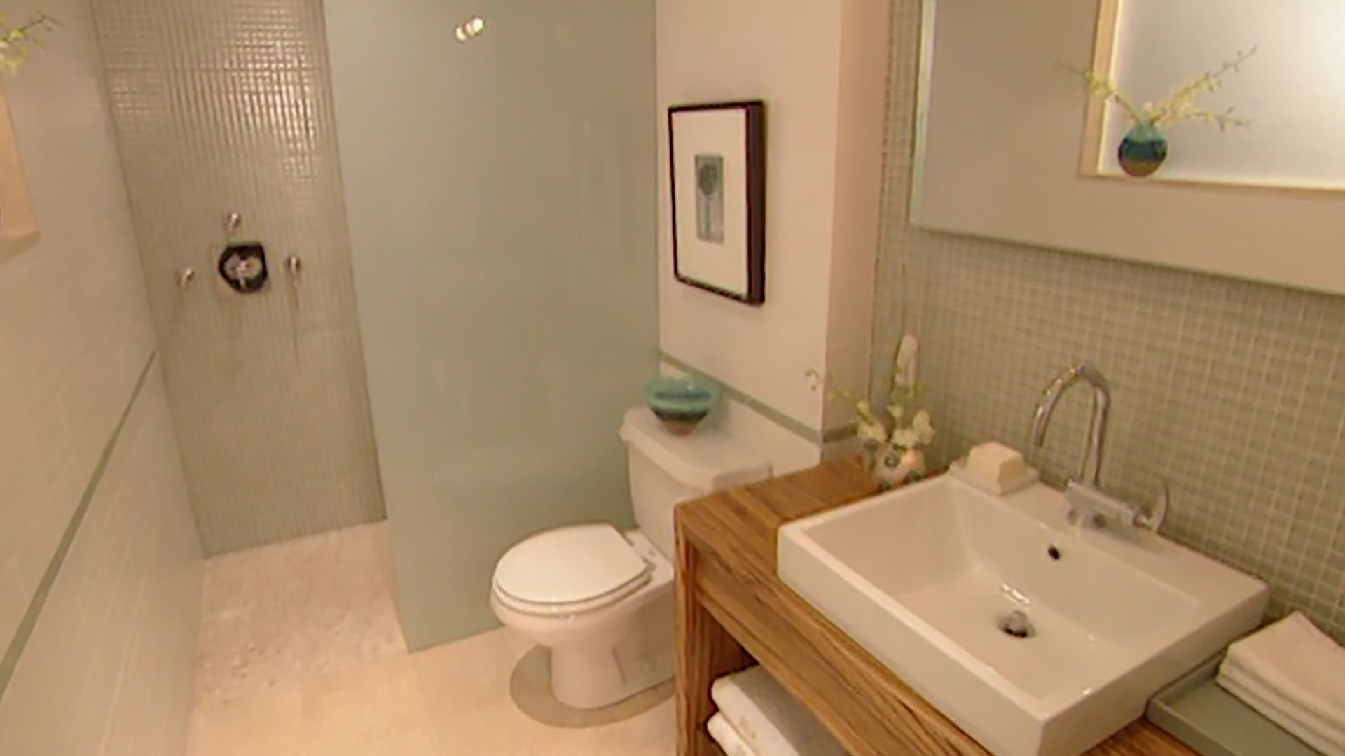 Here's one bathroom that needs a day at the spa. Room Service massages the space into a cool and relaxing retreat. Host Sarah Richardson incorporates exotic wood and natural marble into a water theme that carries right through to touches such as sandblasted glass and chrome. We see firsthand what goes into the design of bathroom faucets, and create bath salts that are sublime. It's a light and invigorating refuge from a hectic day!