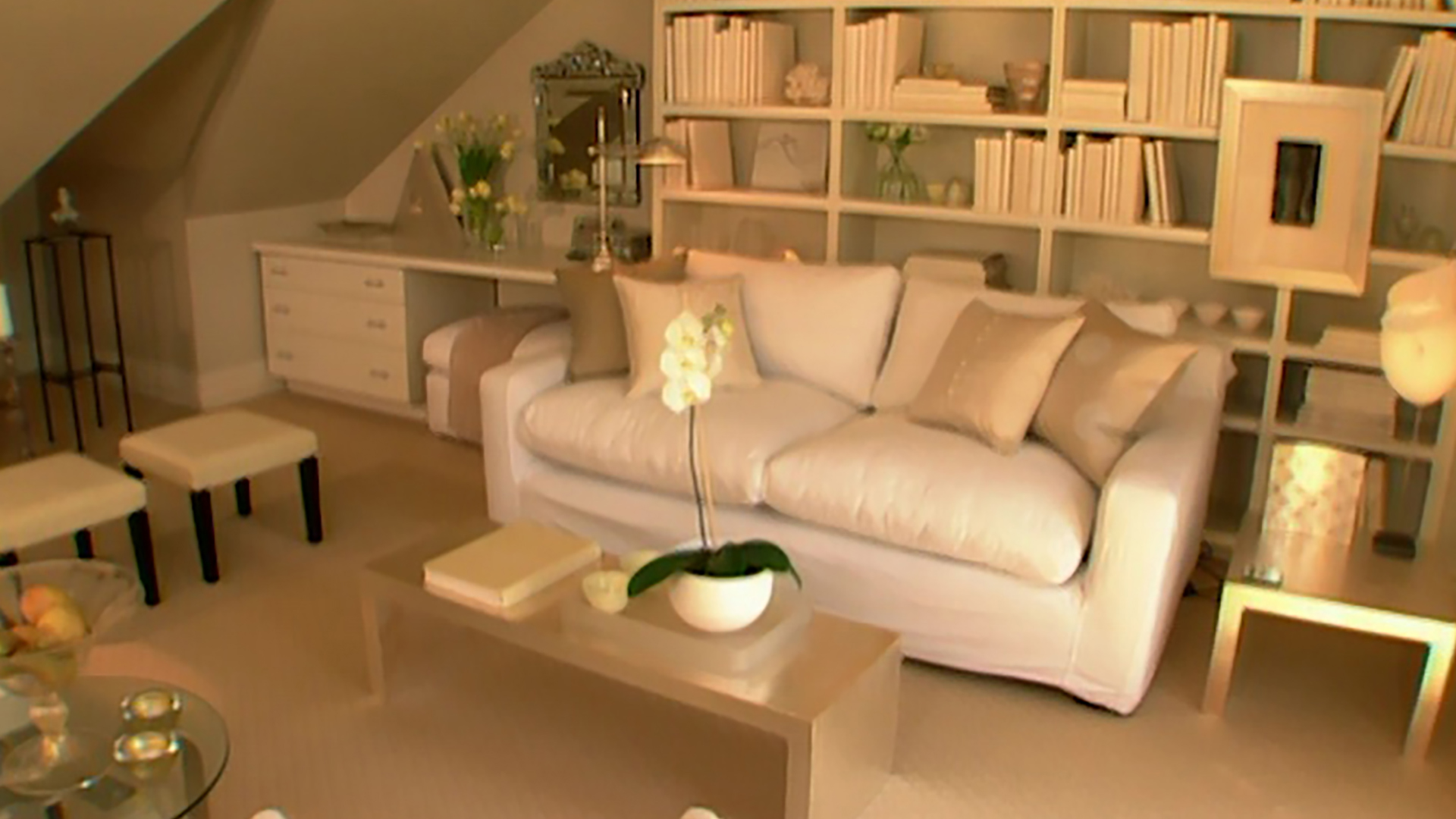 Come stay a while! Room Service helps a guestroom live a variety of lives at once. Host Sarah Richardson refines the library/TV room/guestroom with hints of pale green, white and gold. Treasured books are wrapped in fine papers; an artisan crafts silver-leafed occasional tables that add shimmer. It's an art-filled oasis that's versatile and chic, perfectly suited to its eclectic owner.