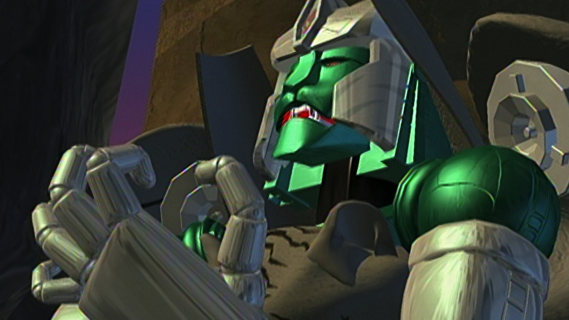 Dinobot hands over one of the golden discs to Megatron, betraying the Maximals.