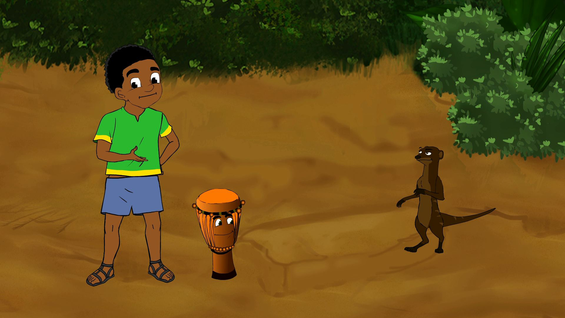 Jabu and puppy pick up sticks and rope to make a monkey bars and pretend to cross the river full of crocodiles.